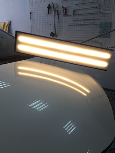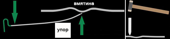 Для выпрямления простой вмятины, например на капоте, исползуется молоток, пластиковый конус, металический инстумент в виде кочерги, упор в виде деревянного бруска, пластинка с контрастными линиями и хороший свет.